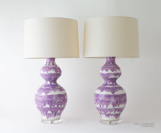 Magic and mystery are often associated with purple, and part of that magic is embodied in lavender and lilac lamps from this collection. If you prefer deep hues of purple, don't miss our glossy, solid grape lamp. This stunning royal shade of purple complements the golden details of our coved gold luster lamp base. The result is an impressive purple nightstand lamp that will surely be a focal point in your bedroom.