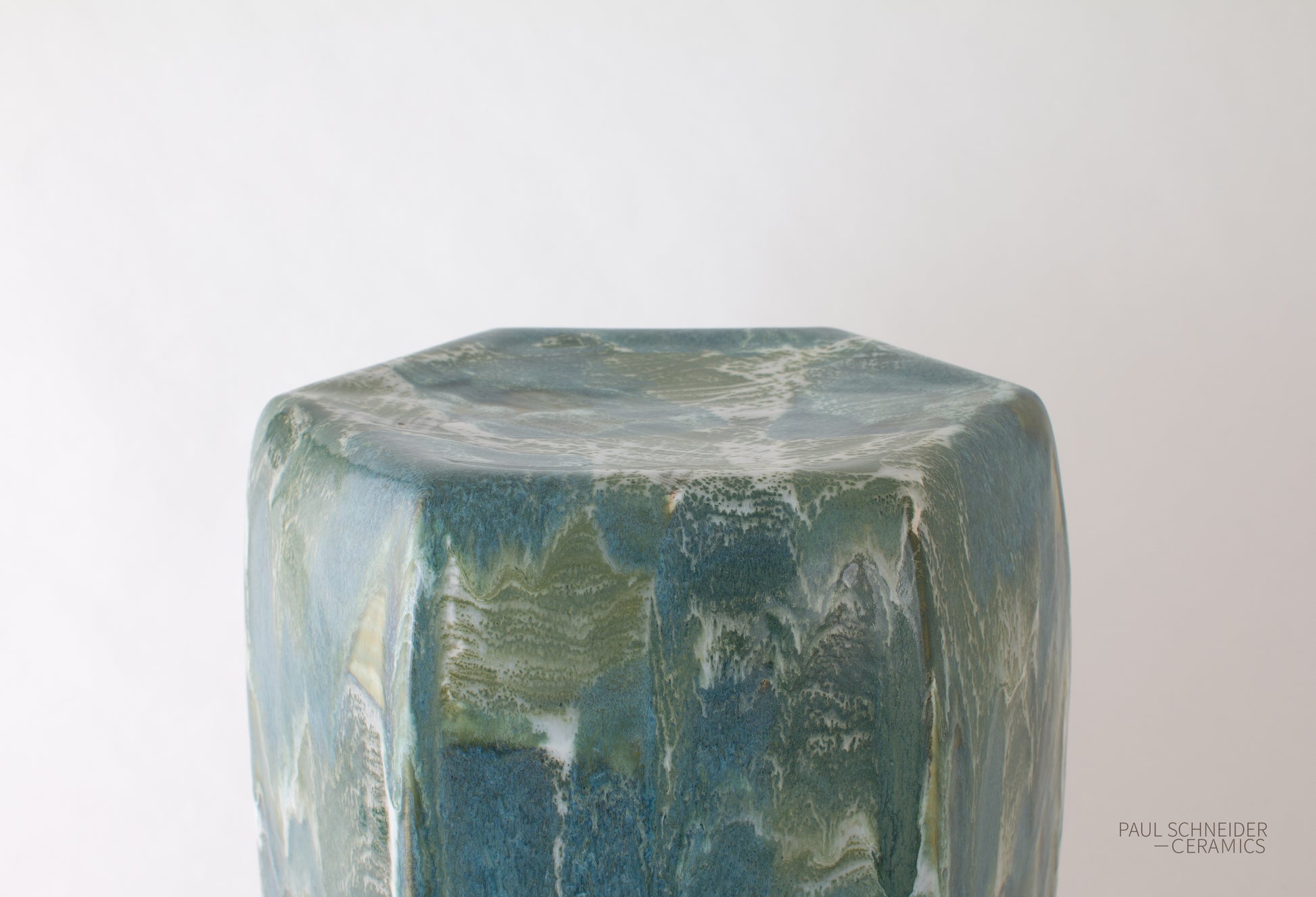 The garden stool is shown with our 6214-M + 6104-M + 6113-M drip brushed glaze.